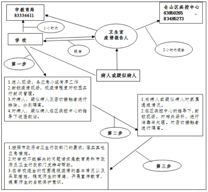 發表時間:2020-08-31 18:17 為了做好學校傳染病的預防與控制工作,控制疫情的傳播、蔓延,保障廣大師生的身體健康和生命安全,根據《中華人民共和國傳染病防治法》、《傳染病信息報告管理規范》、《學校和幼托機構傳染病疫情報告工作規范》、《中小學傳染病預防控制工作管理規范》等相關文件精神,結合我校實際情況,特制定本預案。 一、防控工作目標及原則 (一)總體目標 學校各處室要及時、有效地采取針對學校傳染病的各項防控措施,防止疫情傳入校園,控制疫情的傳播和蔓延,提高應對能力,做到早發現、早報告、早診斷、早隔離、早治療,確保師生員工身體健康,維護學校的穩定。 (二)工作原則 貫徹預防為主,立足平時,防治結合,快速反應,依法管理,分層負責,依靠科學的原則。宣傳普及重大傳染病防治知識,建立防控網絡,實施長效機制,全面落實“早發現、早報告、早診斷、早隔離、早治療”的方針。 1.建立、健全學校傳染病疫情等突發公共衛生事件的發現、收集、匯總與報告管理工作制度; 2.指定專人或兼職教師負責校園內傳染病疫情、因病缺勤等信息的收集、匯總與報告工作; 3.協助疾病預防控制機構對校園發生的傳染病疫情等突發公共衛生事件進行調查和處理,接受教育行政部門與衛生行政部門對學校傳染病疫情等突發公共衛生事件的督促、檢查; 4.組織開展對本單位全體人員傳染病防治知識的宣傳教育; 5.學校校長是傳染病疫情等突發公共衛生事件的第一責任人。 二、組織機構 (一)預防與控制領導小組 組長: 陳正璋(校長)為第一責任人,統一協調指揮全校傳染病疫情等突發公共衛生事件應急處理工作。 副組長:洪淑霞(書記)、林碧珍(副校長)、吳志誠(副校長)、協助校長做好傳染病疫情等突發公共衛生事件的應急處理工作。 組員: 王敏(辦公室主任):負責協調、溝通學校各部門之間的關系,落實上級指示。負責全校教職工的晨檢及病因追蹤登記。 林錚峰(德育處主任):負責做好人員的協調工作、負責日常監測、負責做好宣傳教育工作,提高全體師生的預防意識和防護能力;為學校防控傳染病疫情及突發公共衛生事件工作提供輿論支持。 何林(總務處主任):負責保障傳染病疫情等突發公共衛生事件期間物資供應;負責消毒工作。當學校暴發學校傳染病時,配合衛生部門做好學校暴發疫情的處理等工作。 欒林(教務處主任):負責上報師生每日健康狀況。負責做好病假教師的崗位調配及學生停課、復課的安排。 陳峰(安全干事):是全校應對傳染病疫情等突發公共衛生事件的業務主管及組織管理。 林丹丹、陳捷玲、陳豐穎、劉雪陽、陳丹云、莊飛霞(6位段長)及58名班主任:負責本年級、本班學生的日常監控及每日晨檢工作。 (二)學校疫情報告人的設置 校醫為我校專職傳染病疫情報告人,學校其他教職員工、學生發現傳染病疫情均有義務向專職傳染病疫情報告人提供情況。 劉萍(校醫):學校疫情報告人,在校長的領導下,具體負責本校傳染病疫情和疑似傳染病疫情等突發公共衛生事件報告工作;協助學校建立、健全傳染病疫情等突發公共衛生事件監測、發現及報告相關工作 制度及工作流程;定期對全校學生的出勤、健康情況進行巡查;負責指導全校學生的晨檢工作。 三、具體防控措施 (一)學校傳染病疫情監測 建立學生晨檢、因病缺勤病因追查與登記制度。學校的老師發現學生有傳染病早期癥狀、疑似傳染病病人以及因病缺勤等情況時,應及時報告給學校疫情報告人。學校疫情報告人應及時進行排查,并將排查情況記錄在學生因病缺勤、傳染病早期癥狀、疑似傳染病病人患病及病因排查結果登記日志上。 1.晨、午檢 晨、午檢應由班主任或值班老師對到校的每個學生進行觀察、詢問,了解學生出勤、健康狀況。發現學生有傳染病早期癥狀(如發熱、皮疹、腹瀉、嘔吐、黃疸等)以及疑似傳染病病人時,應當及時告知學校疫情報告人,學校疫情報告人要進行進一步排查,以確保做到對傳染病病人的早發現、早報告。 2.因病缺勤病因追查與登記 班主任及科任教師應當密切關注本班學生的出勤情況,對于因病缺勤的學生,應當了解學生的患病情況和可能的病因,如有懷疑,要及時報告給學校疫情報告人。學校疫情報告人接到報告后應及時追查學生的患病情況和可能的病因,以做到對傳染病病人的早發現。 (二)學校傳染病疫情報告 1.疫情報告內容及時限 (1)在同一班級,1天內有3例或者連續3天內有多個學生(5例以上)患病,并有相似癥狀(如發熱、皮疹、腹瀉、嘔吐、黃疸等)或者共同用餐、飲水史時,學校疫情報告人應當在24小時內報出相關信息。 (2)當學校發現傳染病或疑似傳染病病人時,學校疫情報告人應當立即報出相關信息。 (3)個別學生出現不明原因的高熱、呼吸急促或劇烈嘔吐、腹瀉等癥狀時,學校疫情報告人應當在24小時內報出相關信息。 (4)學校發生群體性不明原因疾病或者其它突發公共衛生事件時,學校疫情報告人應當在24小時內報出相關信息。 2.報告方式 當出現符合本工作規范規定的報告情況時,學校疫情報告人應當以最方便的通訊方式(電話、傳真等)向屬地疾病預防控制機構(倉山區疾病控制中心疫情報告電話:0591-63050265、83485273),同時,向屬地教育行政部門(福州市教育局電話:0591-83379580)報告。同時積極配合疾控機構的流行病學